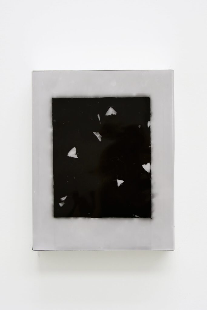 Installationsansicht ‚moths‘ photograms, 2025, Analogprint (Fotogramme), Metallblech, Styropor, je 24 x 30,5 cm.